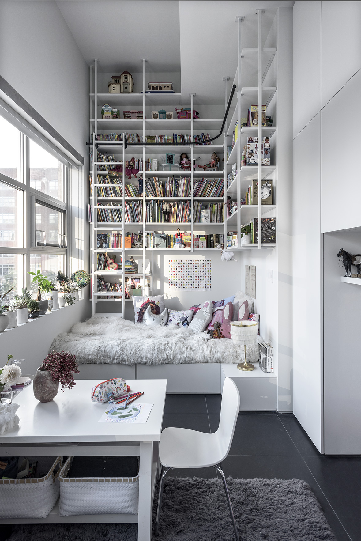 a fab collab came together to get her done—set setting studio on interior design, PROjECT. on decor + styling, KWOWK on project management, and zak rose on furniture fabrication—and turn this architectural anomaly into 6,000-square-feet of beautiful living space that gives top billing to art by glenn ligon, jeffrey gibson, young-il ahn, deborah kass, and nick cave.