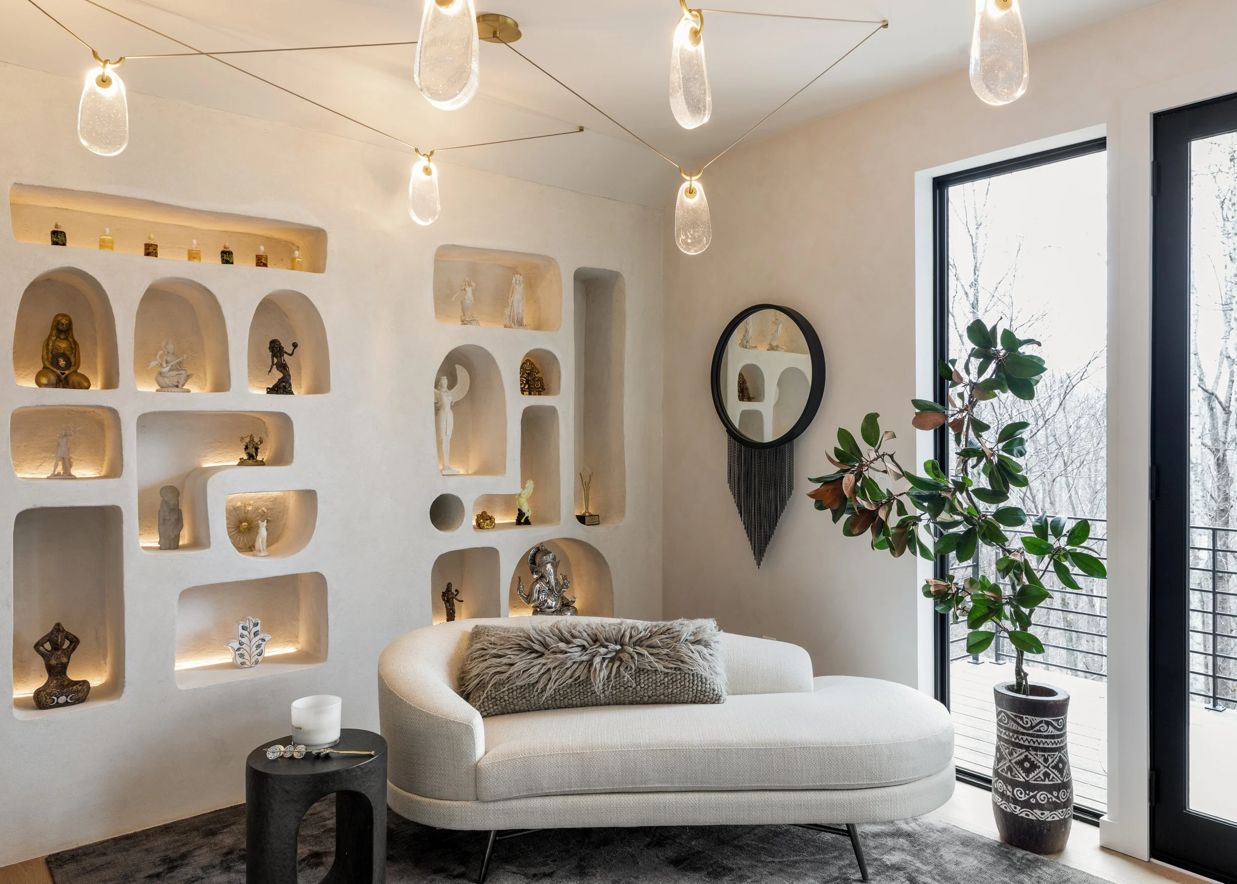 but there’s more: a book nook drenched in clay, mushroom + ink. a banquette upholstered in vintage rugs paired with a tennessee-made table. an office that doubles as a podcast studio/meditation space, facing the forest, with moroccan-style niches for mystical treasures.