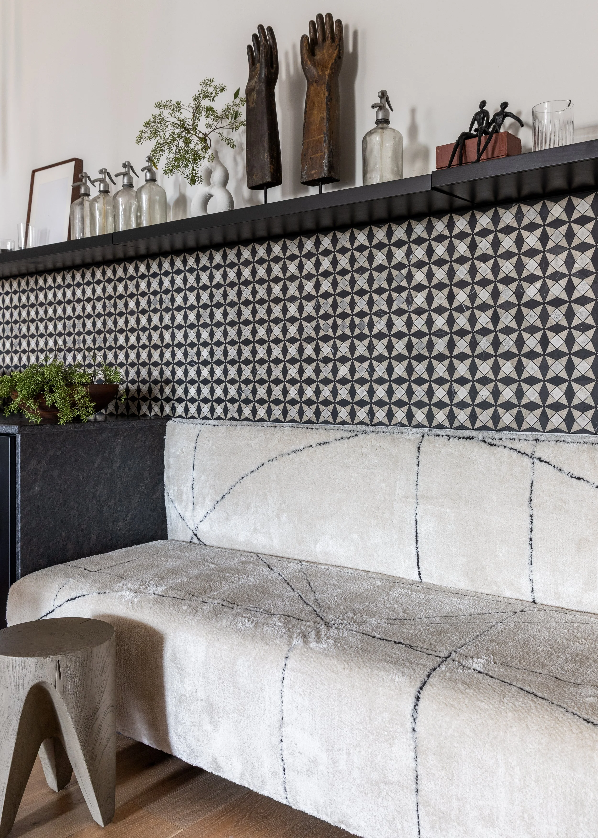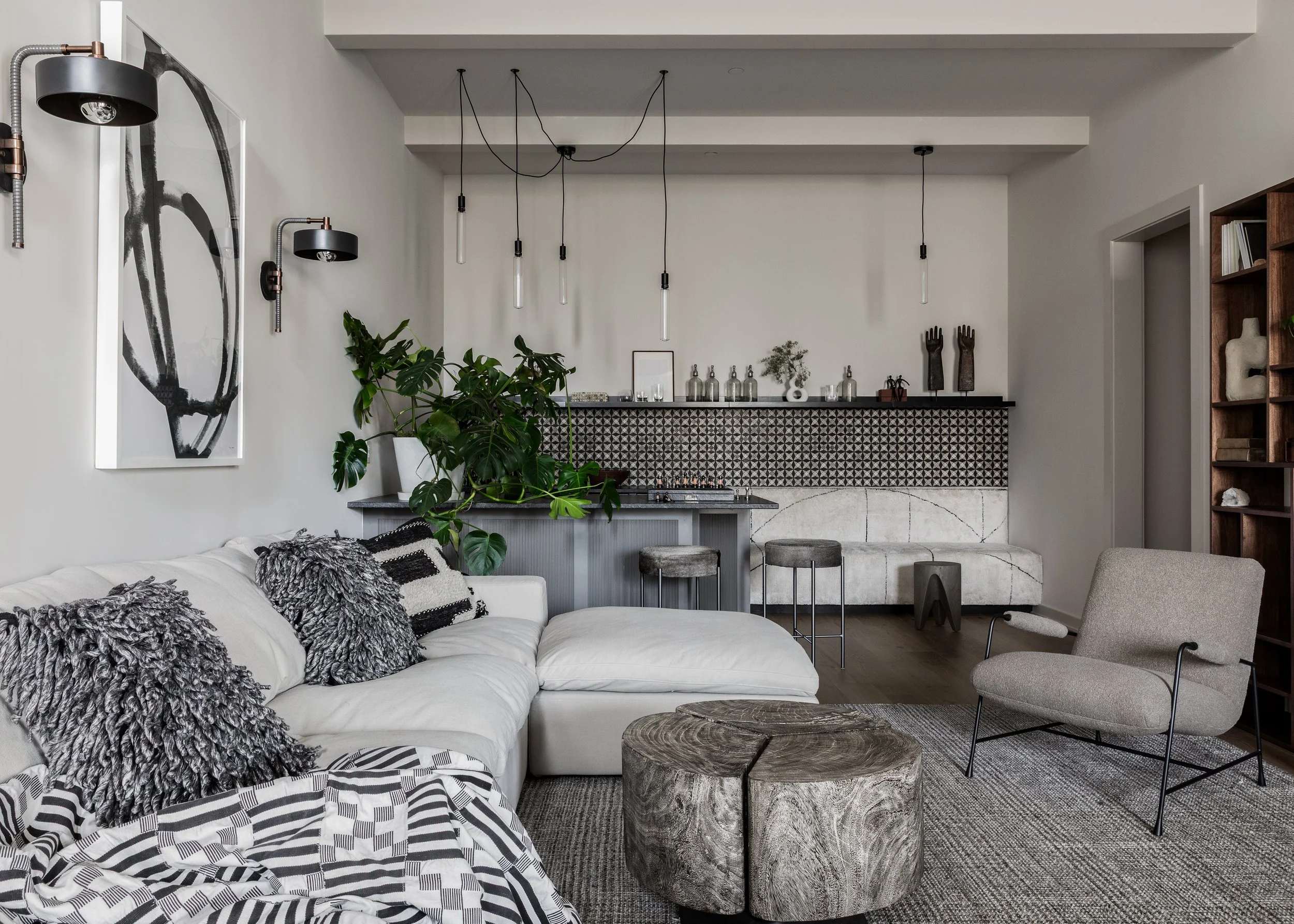 but make it sacred… a monolithic stone island reads like an altar the moment you cross the threshold. a floating, leather-wrapped bar softens the entry + invites intimacy. a living room sectional morphs into a banquette via a single wood console—because flow matters [and gathering is the point].